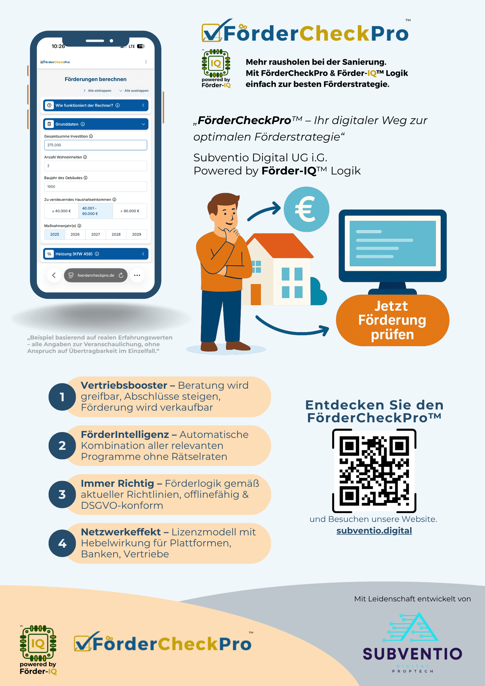 💡 Mit FörderCheckPro™ bieten Sie echten Mehrwert, schaffen Vertrauen und erhöhen Ihre Abschlussquote. Steigern Sie die Fördertransparenz und heben Sie sich vom Wettbewerb ab.